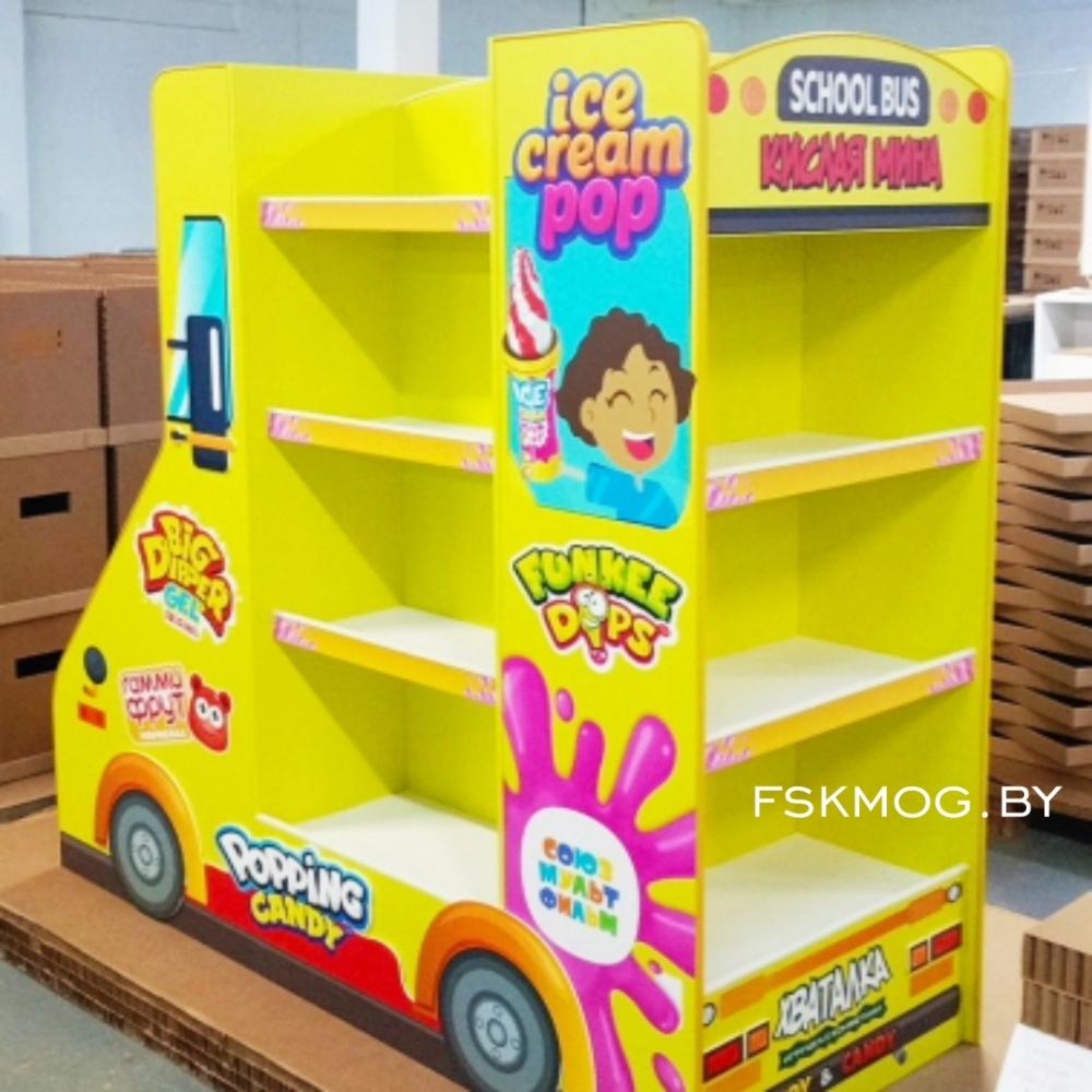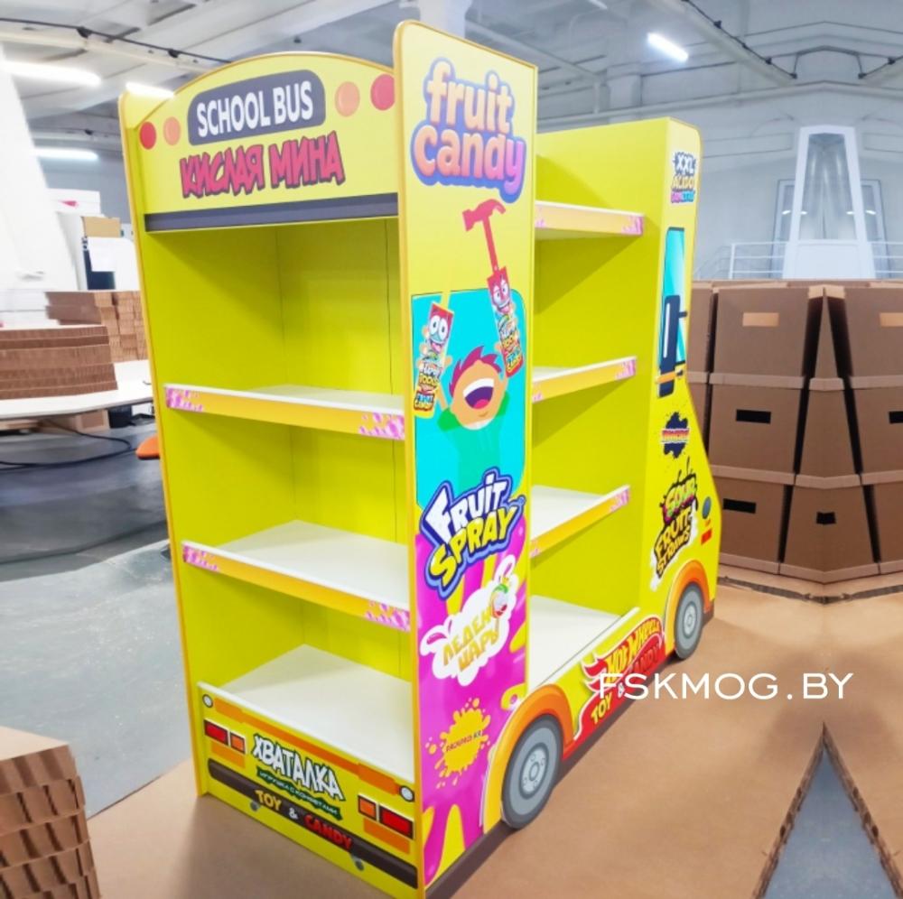 Наша новая разработка — торговая стойка в виде детского автобуса из сотового картона — решает сразу несколько задач современного мерчандайзинга.