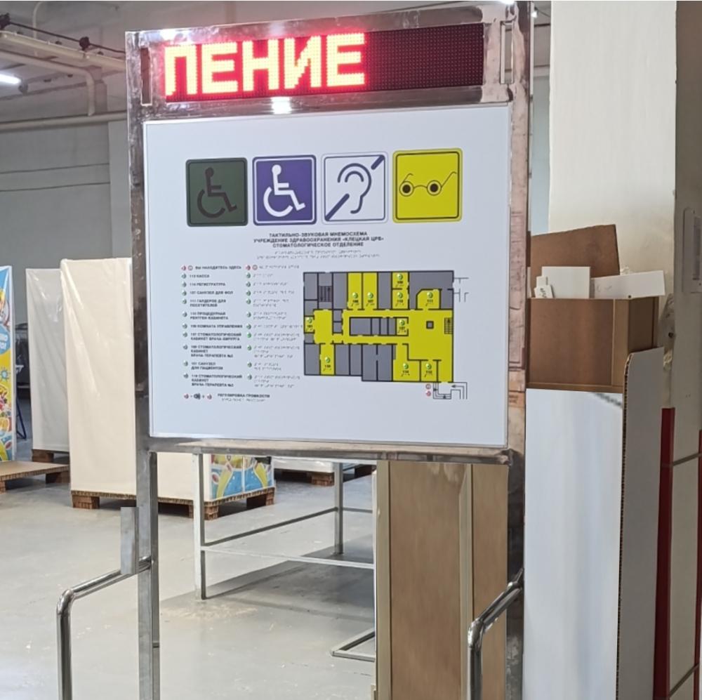 Тактильно-звуковая мнемосхема с бегущей строкой — создаёт новую точку притяжения и ориентации для всех категорий посетителей, включая людей с нарушениями зрения.